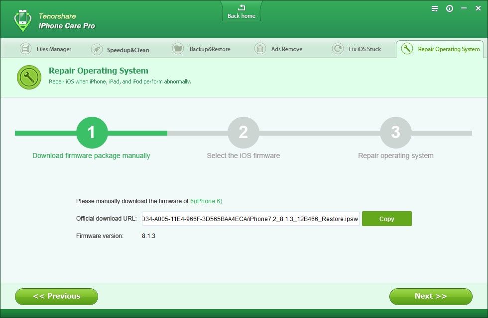 An official download URL of this fireware is given to you. Just copy it. iPhone Care Pro can recognize your device and download the latest iOS version for you. After downloading, click “Next”.
